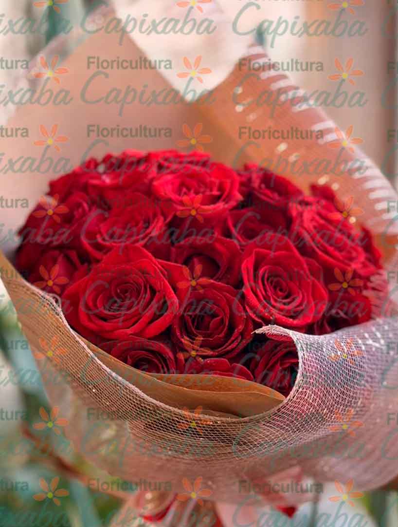 Buquê de 30 Rosas Especiais Colombianas Love, Estilo Botões, Vermelhas, confeccionadas juntas com Embalagem Especial Kraft e Tela. Acompanha Lacinho Duplo de Cetim.