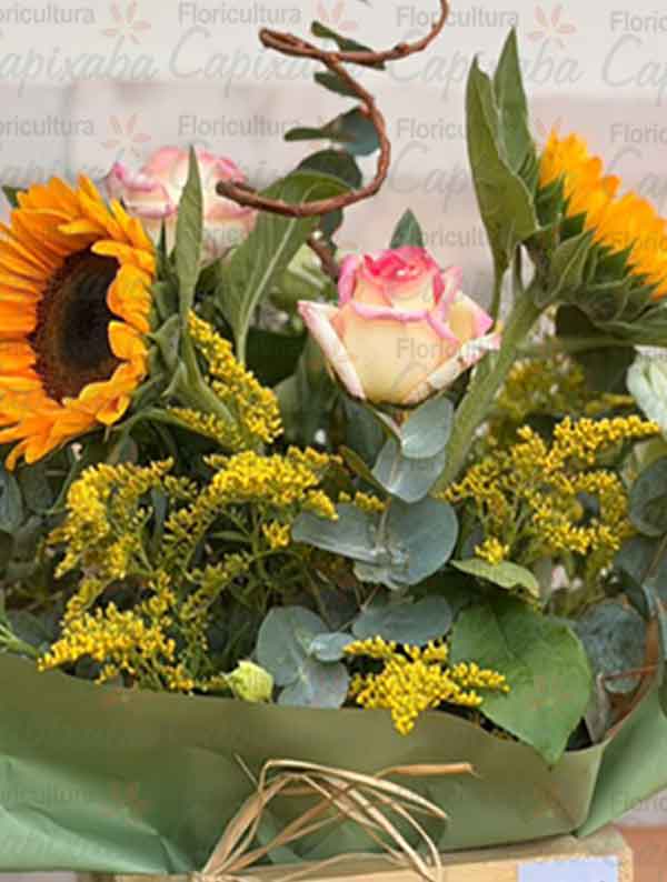Arranjo na Peça Rústica em Treliça, feito com Girassóis e Rosas Nacionais Ambiance, com Complementos de Lisiantos Branco e Folhagens de Eucalipto. Acompanha Decoração de Vime Rústico e Laço de Sisal, com Embalagem de Juta e Papel Dupla Face.